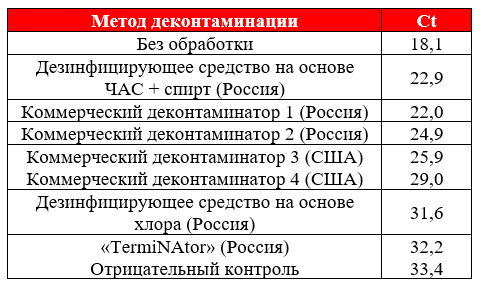 Для обработки рабочих поверхностей и оборудования необходимо одновременно использовать оба флакона, входящих в состав набора. Активация компонентов флаконов происходит только при их взаимодействии, активированные компоненты вызывают быструю деградацию РНК и ДНК. 1. Распылите содержимое 1 и 2 флаконов на сухую рабочую поверхность в соотношении 1:1. Не смешивайте содержимое заранее. Время экспозиции составляет 15 минут. 2. Удалите растворы с поверхности с помощью одноразовых бумажных полотенец. 3. Протрите поверхность одноразовым бумажным полотенцем, смоченным стерильной водой, до полного удаления остатков деконтаминатора. При необходимости повторите процедуру. Окрашивание растворов в кирпичный цвет свидетельствует о загрязнении обрабатываемых поверхностей солями гуанидина. Все реагенты набора являются нетоксичными, при использовании по назначению не представляют опасности для здоровья человека. В таблице 1 представлены усредненные результаты тестирований.