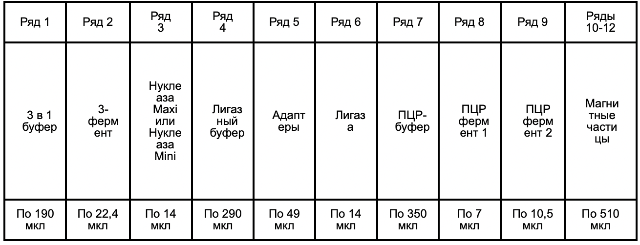 третий планшет – в каждую лунку внести компоненты набора реагентов в соответствии со схемой. После внесения заклеить планшет фольгированной пленкой и осадить капли кратковременным центрифугированием.