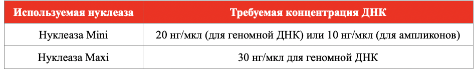 Предварительная подготовка биологического материала Нуклеаза Mini 20 нг/мкл (для геномной ДНК) или 10 нг/мкл (для ампликонов) Нуклеаза Maxi 30 нг/мкл для геномной ДНК