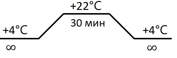 Лигирование 1. Приготовить мастер-микс на необходимое количество реакций: Лигазный буфер 20,5 мкл на 1 реакцию Адаптеры 3,5 мкл на 1 реакцию Лигаза 1 мкл на 1 реакцию 2. Перемешать мастер-микс, сбросить капли с помощью кратковременного центрифугирования. 3. После завершения программы фрагментации внести 25 мкл мастер-микса к образцам. 4. Установить программу для лигирования. Поместить пробирки в амплификатор с предварительно установленной программой для лигирования после выхода прибора в рабочее состояние 1-го этапа: 5. После установки пробирок в амплификатор необходимо пропустить первый этап.