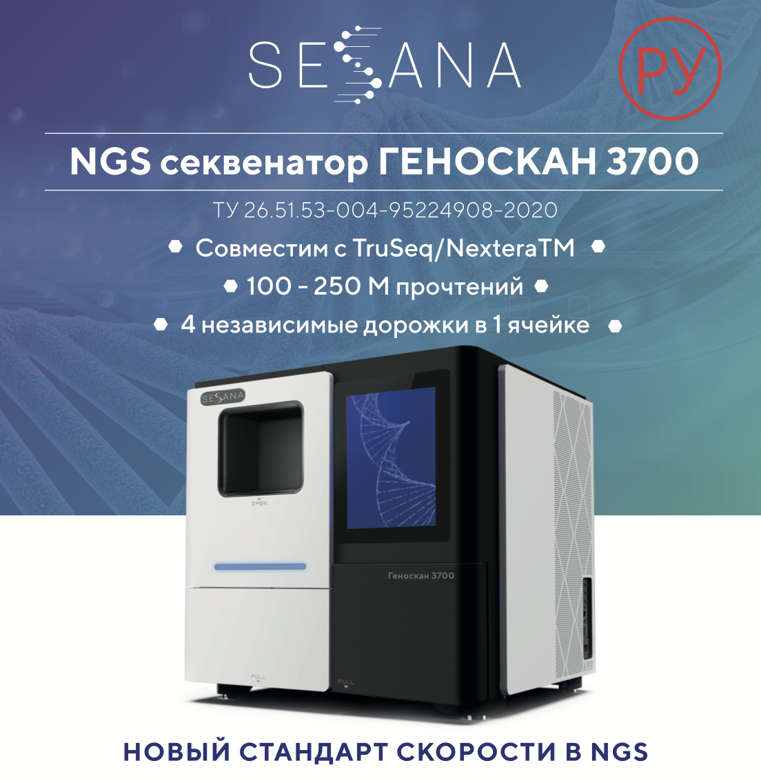 Секвенатор Геноскан 3700 — компактная и вместе с тем мощная система нового поколения, обеспечивающая от 100 до 250 миллионов прочтений за запуск, с четырьмя независимыми дорожками в одной ячейке. Как и старшая модель, Геноскан 3700 имеет Регистрационное удостоверение медицинского изделия РУ, что делает его доступным для использования в медицинских лабораториях. Благодаря этому прибор может применяться в клинико-диагностических центрах, где важно сочетание высокой скорости анализа с надежностью результатов и юридической корректностью использования оборудования.