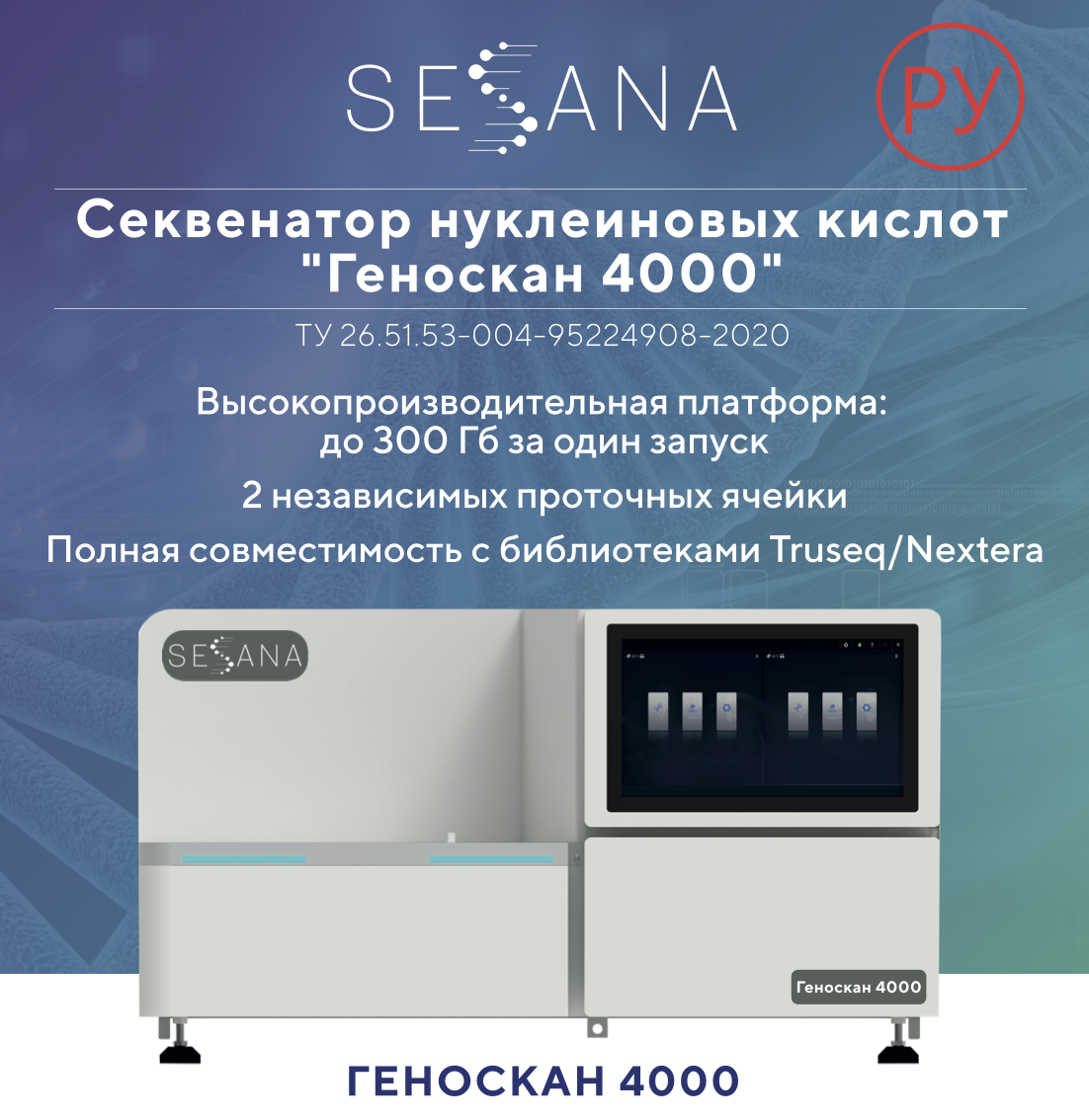 Секвенатор Геноскан 4000 — высокопроизводительная платформа, обеспечивающая до 300 Гб данных за один запуск, оснащенная двумя независимыми проточными ячейками и полностью совместимая с библиотеками TruSeqNextera. Прибор имеет Регистрационное удостоверение медицинского изделия РУ, что подтверждает его официальное разрешение для применения в медицинских организациях Российской Федерации. Это позволяет использовать Геноскан 4000 не только в научных исследованиях, но и в клинической практике — для диагностики наследственных заболеваний, инфекционных патологий, мониторинга онкологических процессов и других медицинских задач.